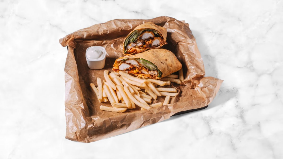 tortilla plněná ledovým salátem, kuřecími stripsy, restovanou pančetou, caesar dresinkem, parmazánem, podávaná s hranolky a česnekovou crémou (1,3,4,7,10)