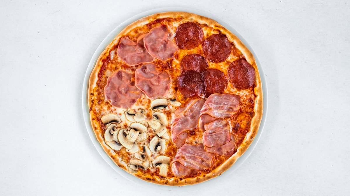 tomato, mozzarella, šunka, salám, žampiony, slanina, cibule, kukuřice, 4 druhy sýra