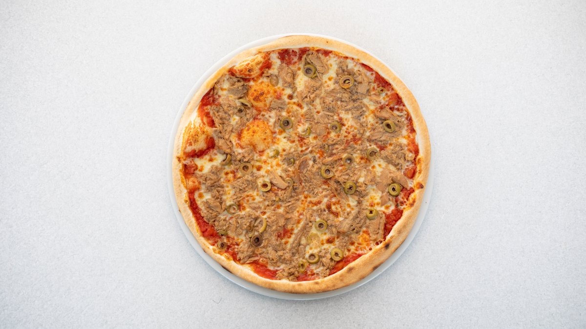 smetana, mozzarella, šunka, tuňák, olivy