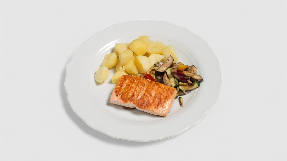 STEAK Z LOSOSA S GRILOVANOU ZELENINOU A VAŘENÝM BRAMBOREM