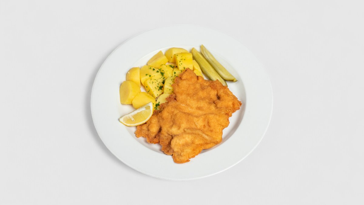 SMAŽENÝ KUŘECÍ ŘÍZEK S OKURKOU A VAŘENÝM BRAMBOREM