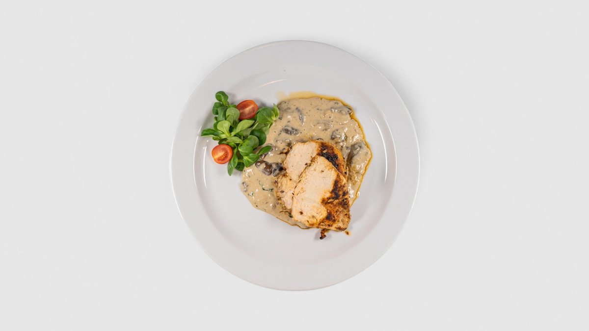 KUŘECÍ STEAK S HŘÍBKOVOU OMÁČKOU, ŠŤOUCHANÉ BRAMBORY