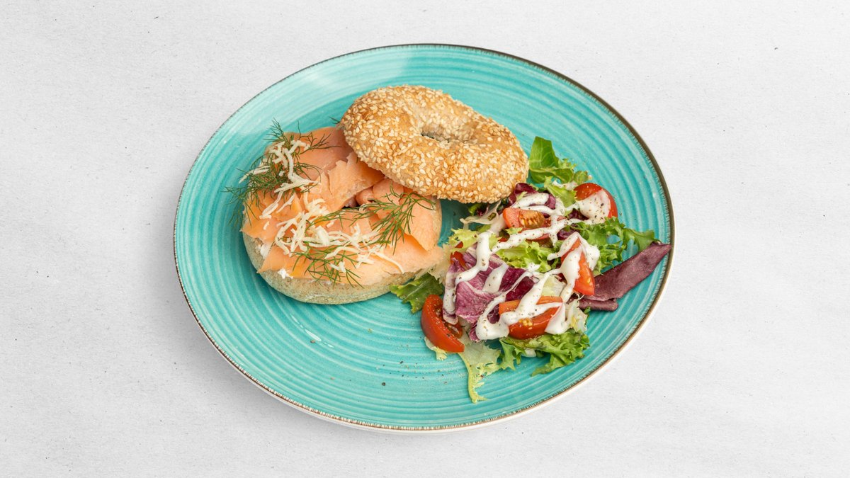 Rozpékaný bagel s lososem a malým salátkem
