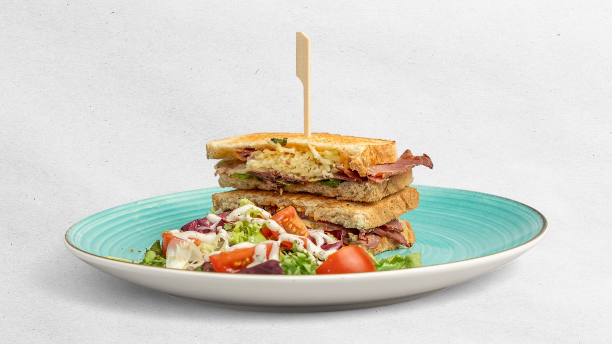 Rozpékaný toast šunka a sýr s malým salátkem, dresink