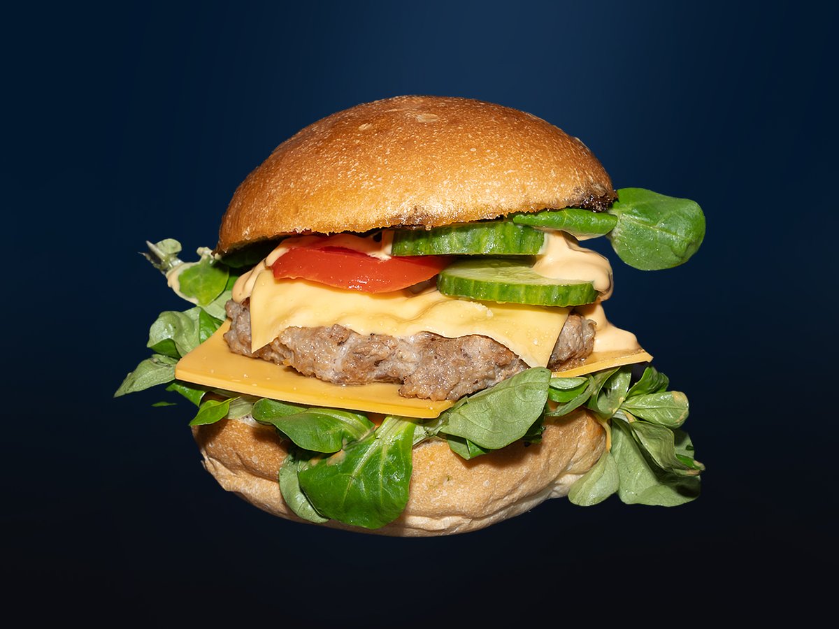 Náš klasický sýrový hamburger začíná šťavnatým masem, oslnivě spojeným s plátky sýra, připravenými na dokonalé teplotě, aby se rozplynuly v každém soustu.