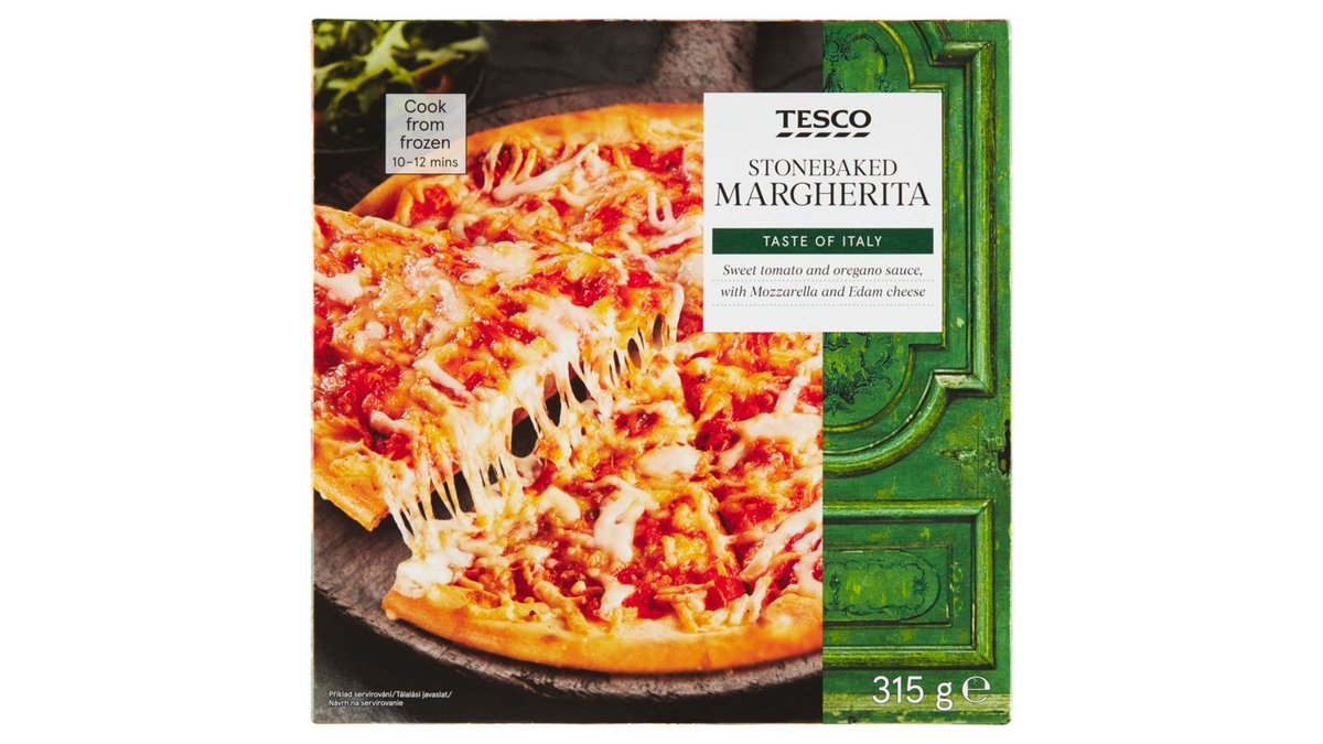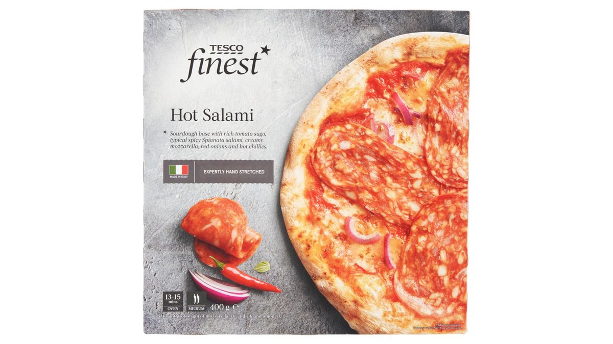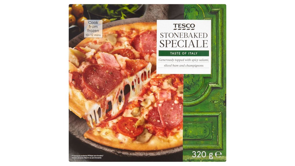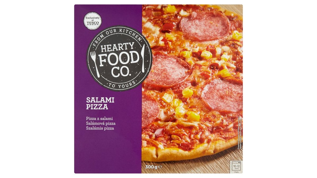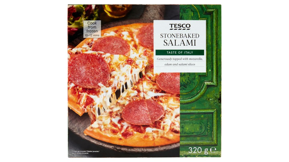 Tesco Pizza pečená v kamenné peci s rajčatovým protlakem, salámem a strouhanými sýry 320g