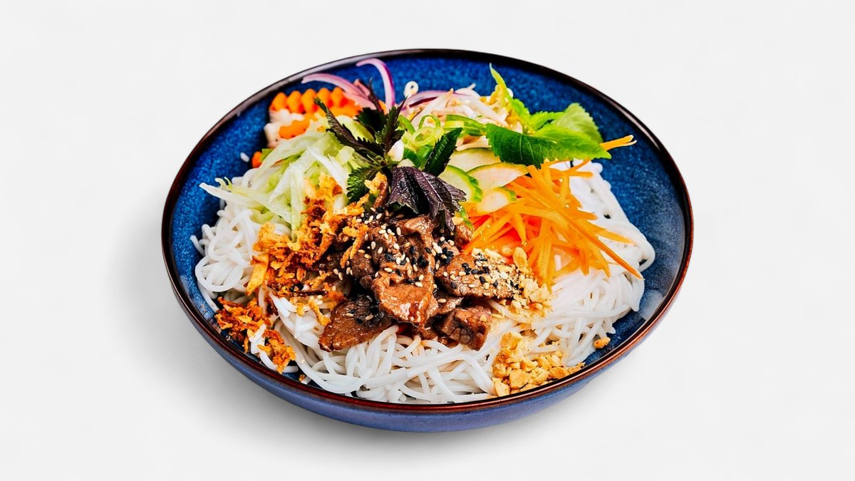 rýžové nudle s restovaným hovězím masem, čerstvým salátem, arašídy, smažená cibulka a sladkokyselá zálivka.