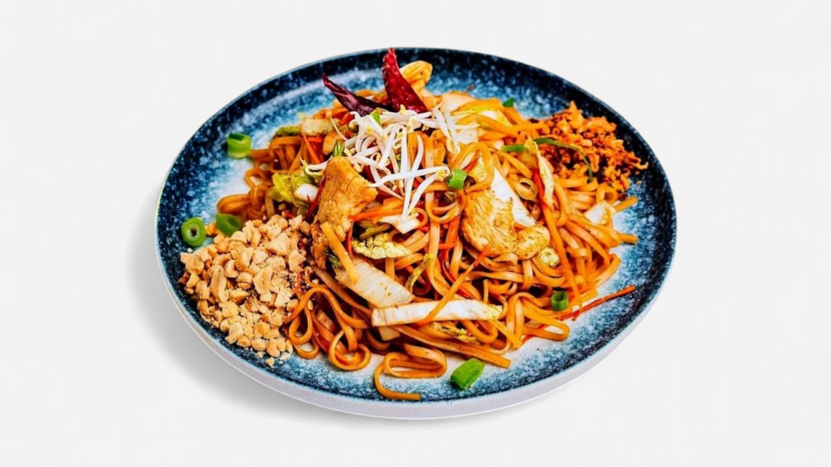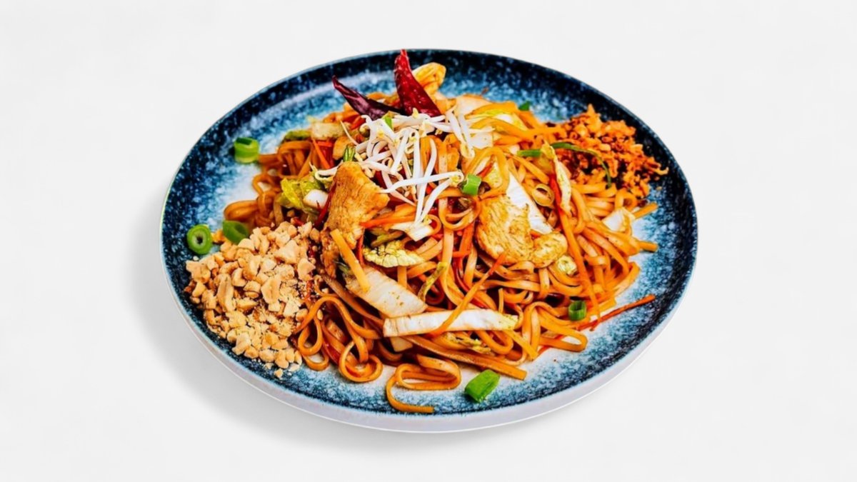 rýžové nudle s restovaným kuřecím masem, čerstvým salátem, arašídy, smažená cibulka a sladkokyselá zálivka.