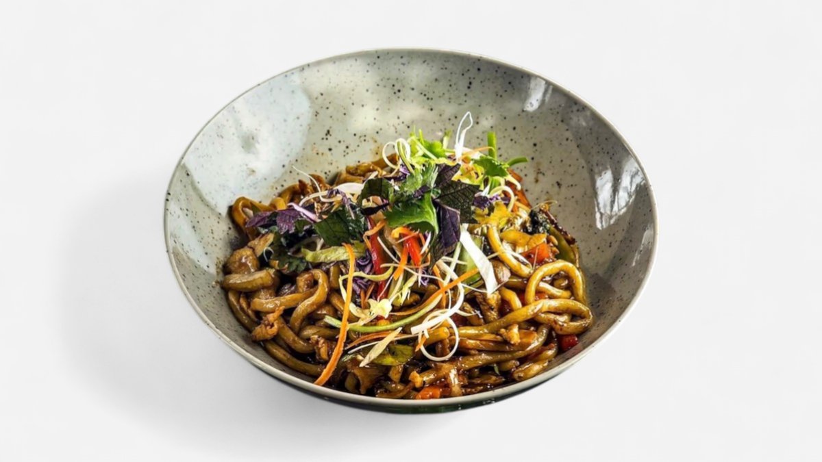 Lřupavé kachní stehno, sladká Teriyaki omáčka, restované udon nudle, zelenina, smažená cibulka