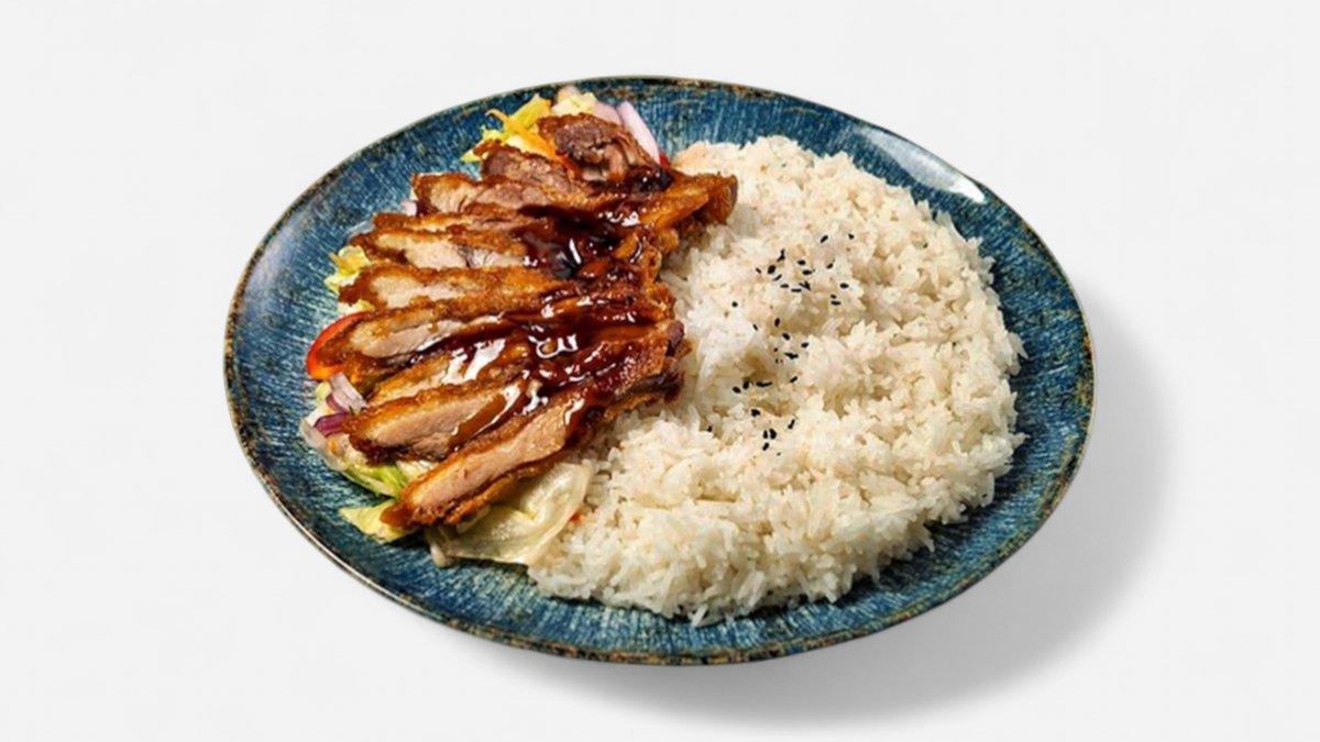 Křupavý kuřecí řízek obalovaný v Panko strouhance, rýže, sladkokyselá japonské Tonkatsu omáčka, chilli majonéza, nakládané zelenina