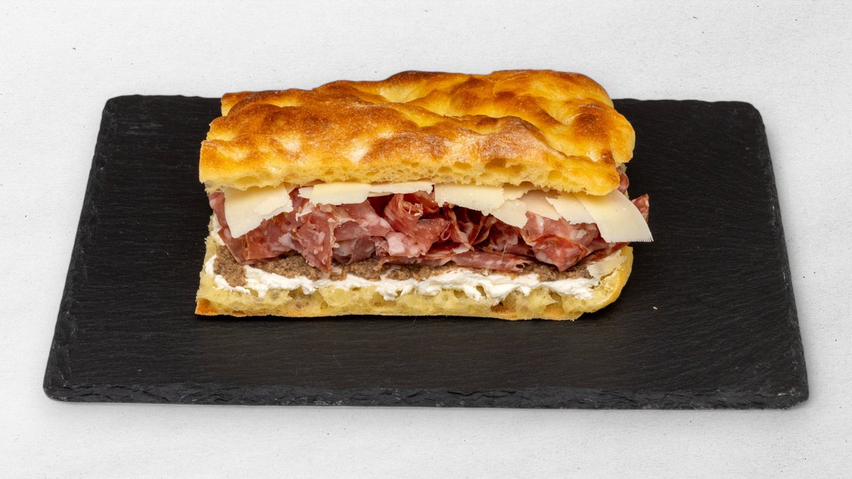 Italský salám Finocchiona + sýr Pecorino + krém z italského sýru Pecorino + krém z černých lanýžů + extra panenský olivový olej