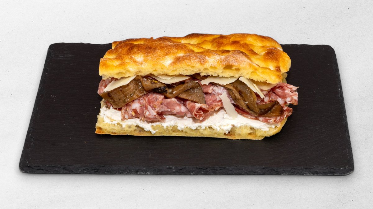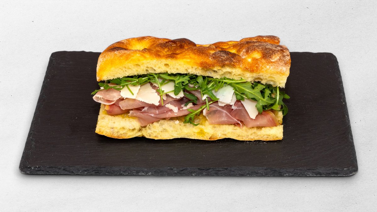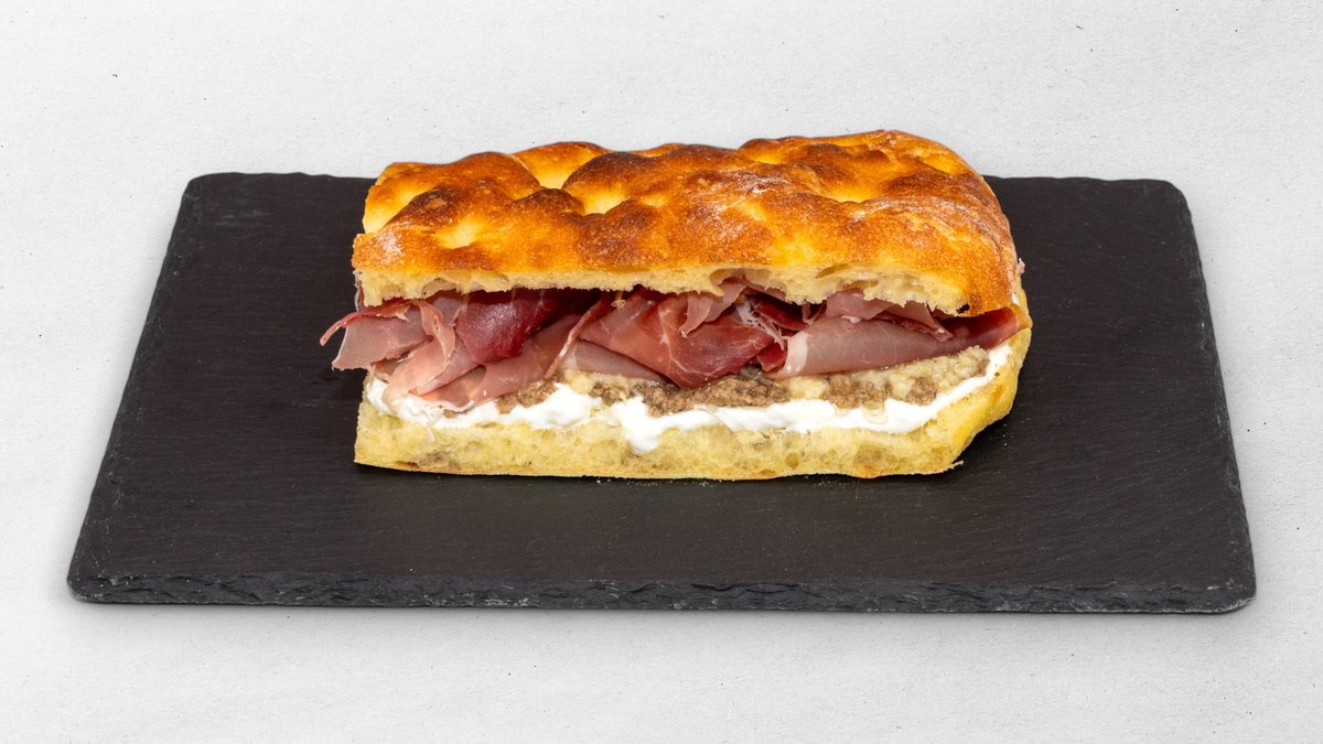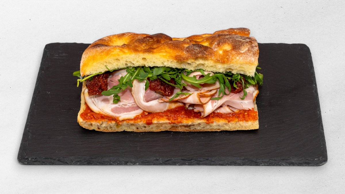 Italská masová roláda Porchetta + crema piccante + sušená rajčata + salát rukola + extra panenský olivový olej