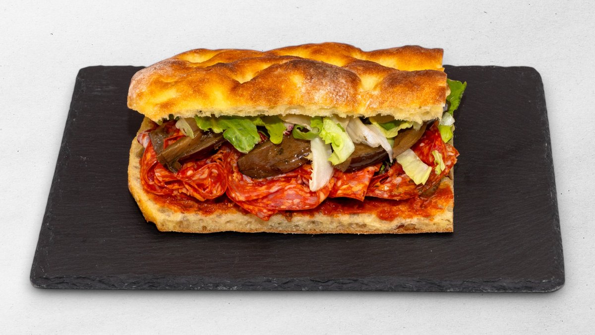 Italský pikantní salám Ventricina + crema Piccante + lilek + směs salátů