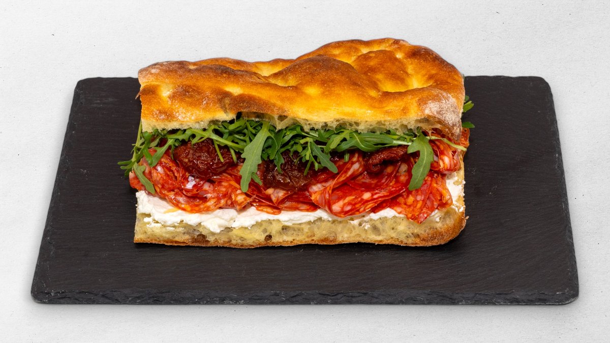 Italský pikantní salám Ventricina + krém z italského sýru Pecorino + sušená rajčata + salát rukola + extra panenský olivový olej