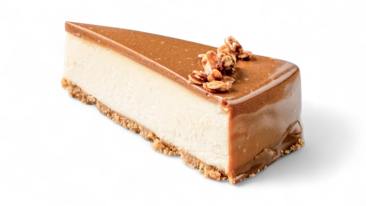 Nadýchaný dort se základem z digestive a karamelových sušenek, krémem s vysokým obsahem arašídů a zrcadlovou karamelovou polevou. Navrch je zdobený křupavou granolou z pekárny CrossCafe.
