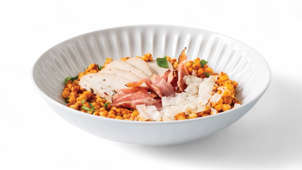 Chuťově výrazný pokrm z tarhoni, drobných těstovin s jemně oříškovou chutí, kousky kuřecího masa, křupavou slaninou a pestem ze sušených rajčat z dílny kuchařů CrossCafe. Jídlo je dochucené krájenými sušenými rajčaty a sýrem Grana Padano. Ideální se hodí jako vydatný a chutný oběd.