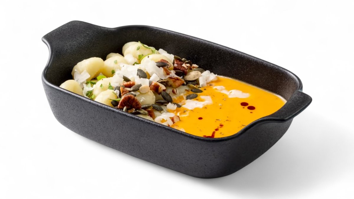 Vláčné bramborové noky v krémové omáčce z pečené dýně. Chuťově bohatý a výživově vyvážený pokrm doplněný sýrem Grana Padano a křupavým mixem dýňových semínek a oříšků. Vhodný pro vegetariány.