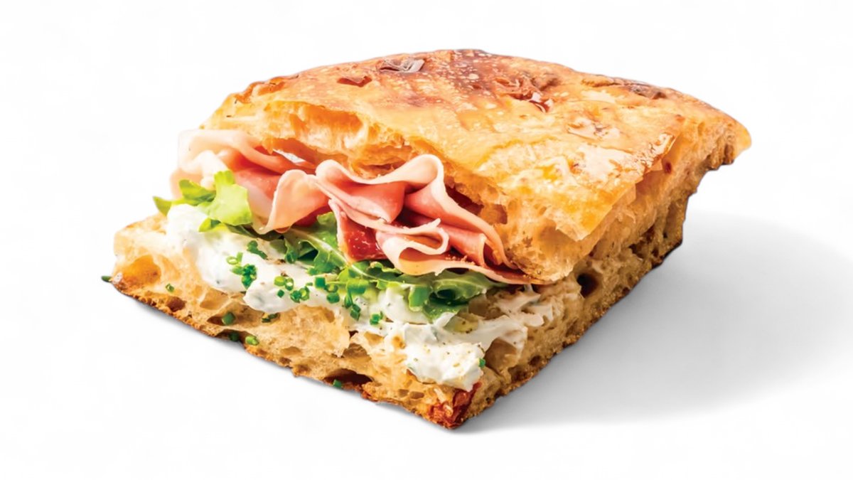 Vláčné pečivo s charakteristicky křupavou kůrkou se šunkou, mozzarellou a rajčatovým pestem. Chuť sendviče podtrhují pečená rajčata a lístky rukoly. Nejlépe chutná rozpečený.