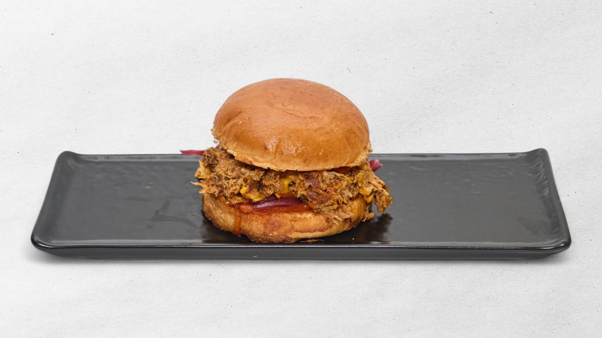 Trhané vepřové maso Cheddar Nakládaná červená cibule Smažená cibule Rajče Domácí BBQ omáčka