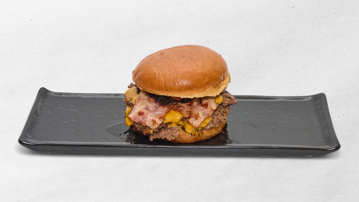 Dvojitá porce mletého hovězího Chuck- roll Dvojitá porce slaniny Cheddar Cibulové chutney Nakládaná okurka Domácí kečup