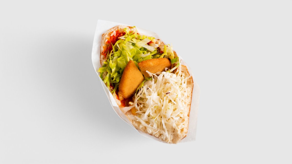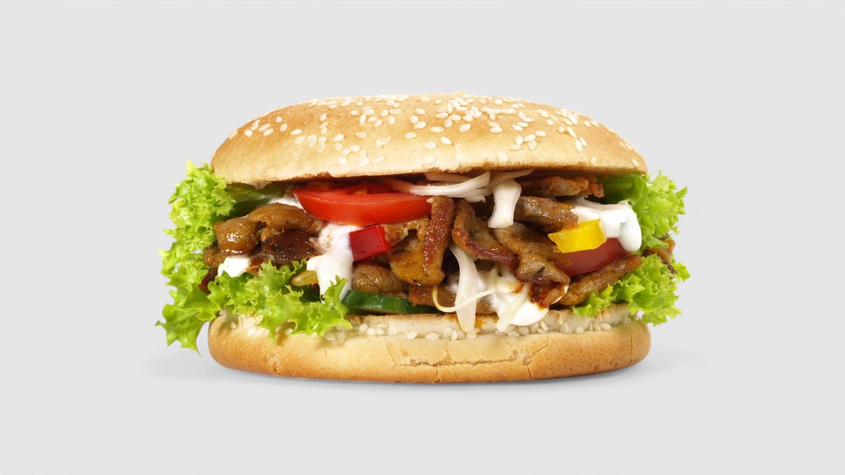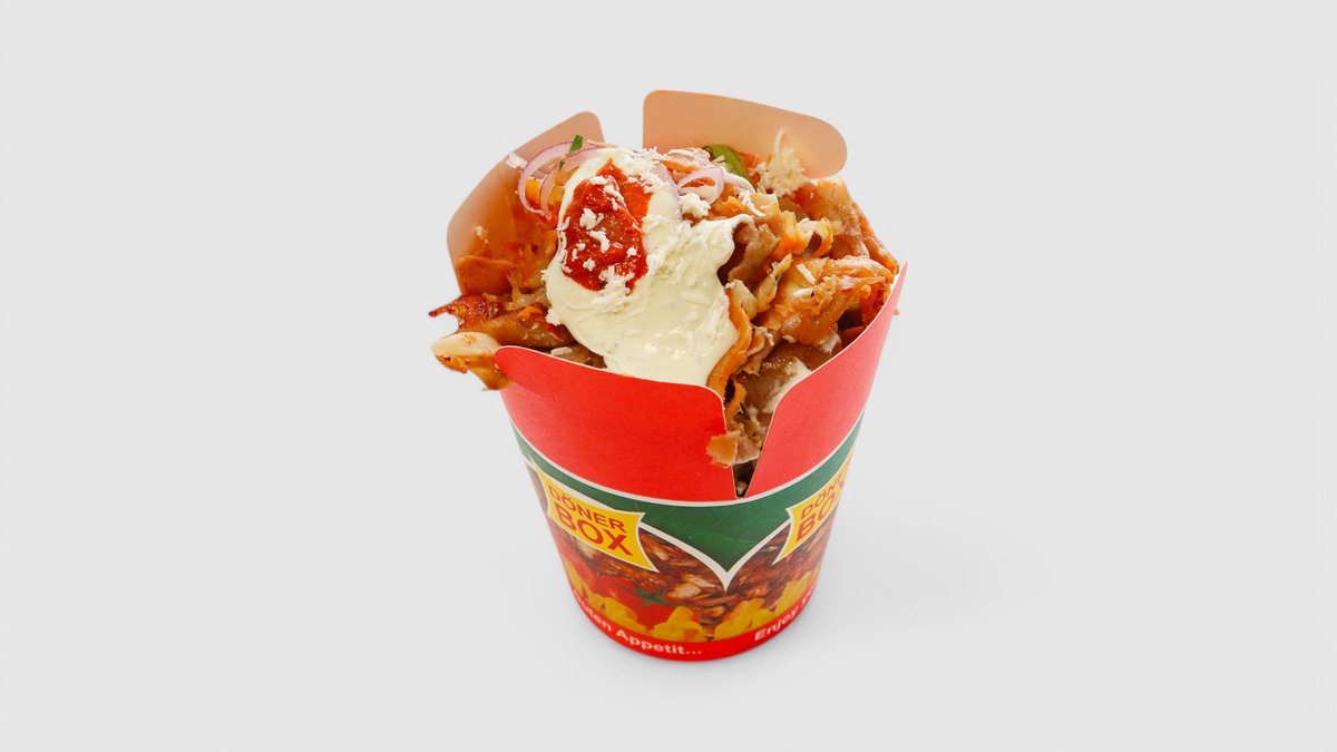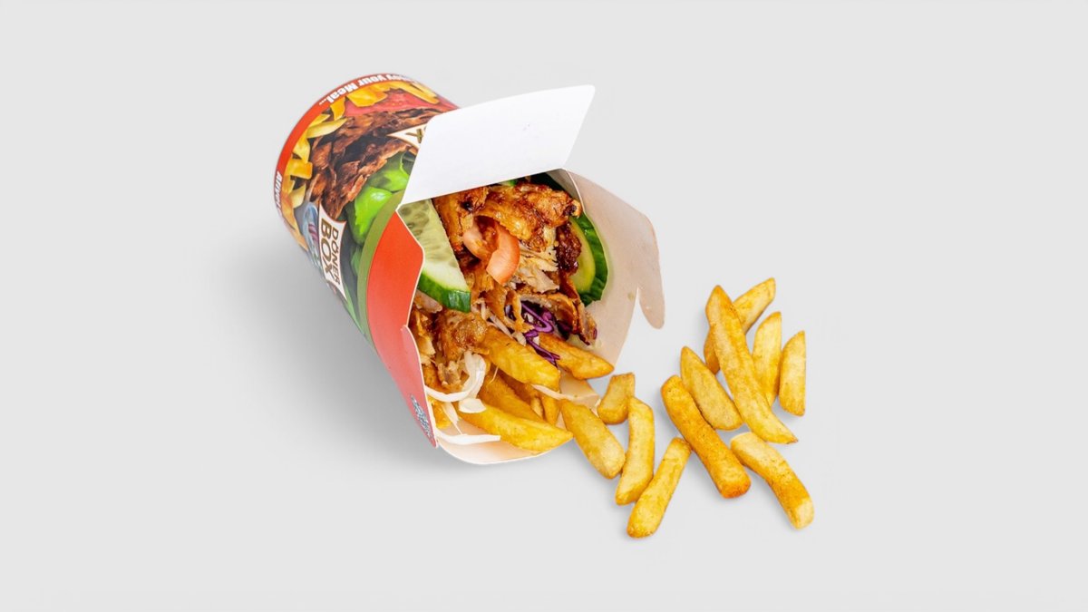 Zeleninový salát, döner 150 g, chléb, omáčka. Příloha dle vlastního výběru: hranolky, rýže, kuskus