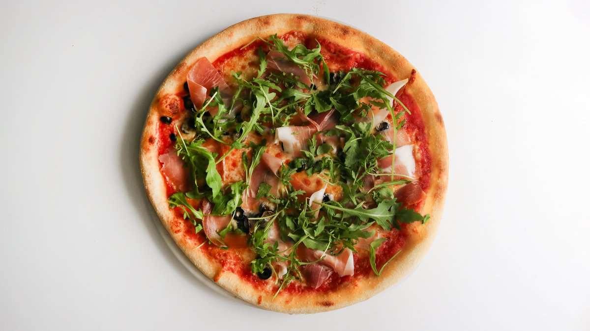 tomat, prosciutto serrano, mozzarella, rukola, oregáno