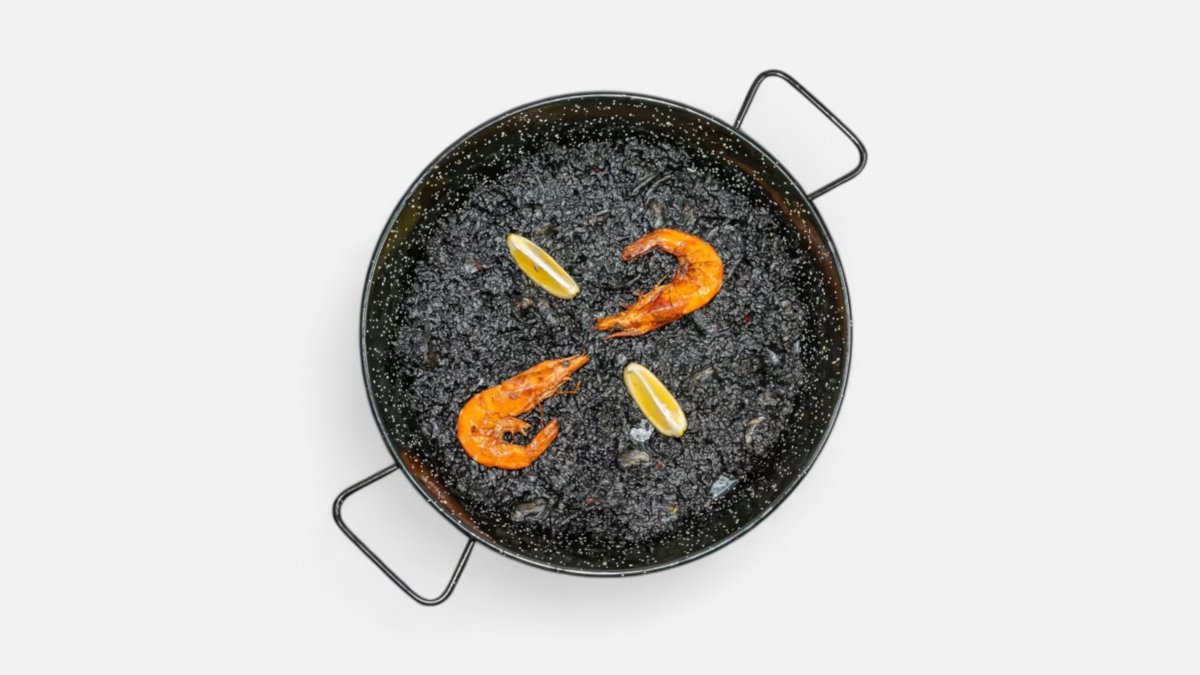 Tradiční španělská rýže barvená inkoustem ze sépie, připravovaná s mořskými plody, 200 g (A: 2, 4, 9, 12, 14)