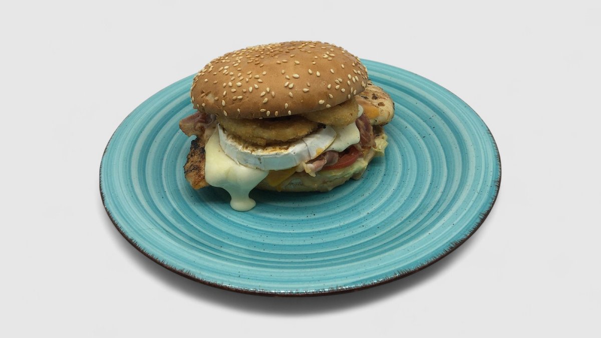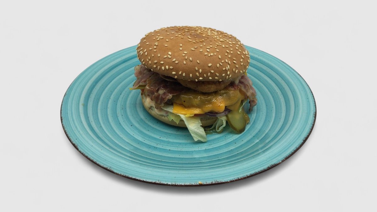 Bulka 120g vlastní výroba. Hovězí maso 200g vlastní výroby, anglická slanina, sýr cheddar, ledový salát, cibulové kroužky 2ks, nakládaná okurka, zelenina, rajče, bbq dresing.