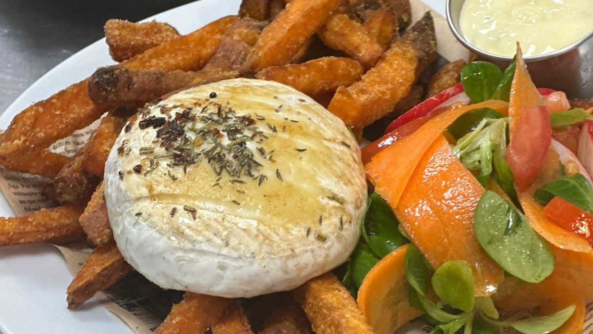 camembert na grilu, jar. cibulka, salátek, omáčka 40g, batátové hranolky 200g (3,7)