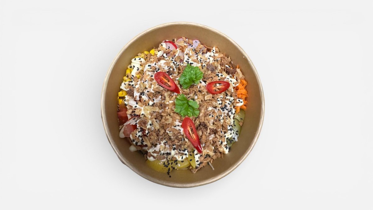 naše trhané kuřecí 70g rýže, mayo, zelenina, sezam, cibulka, petržel, chilli (1,3,6,7,9,11)