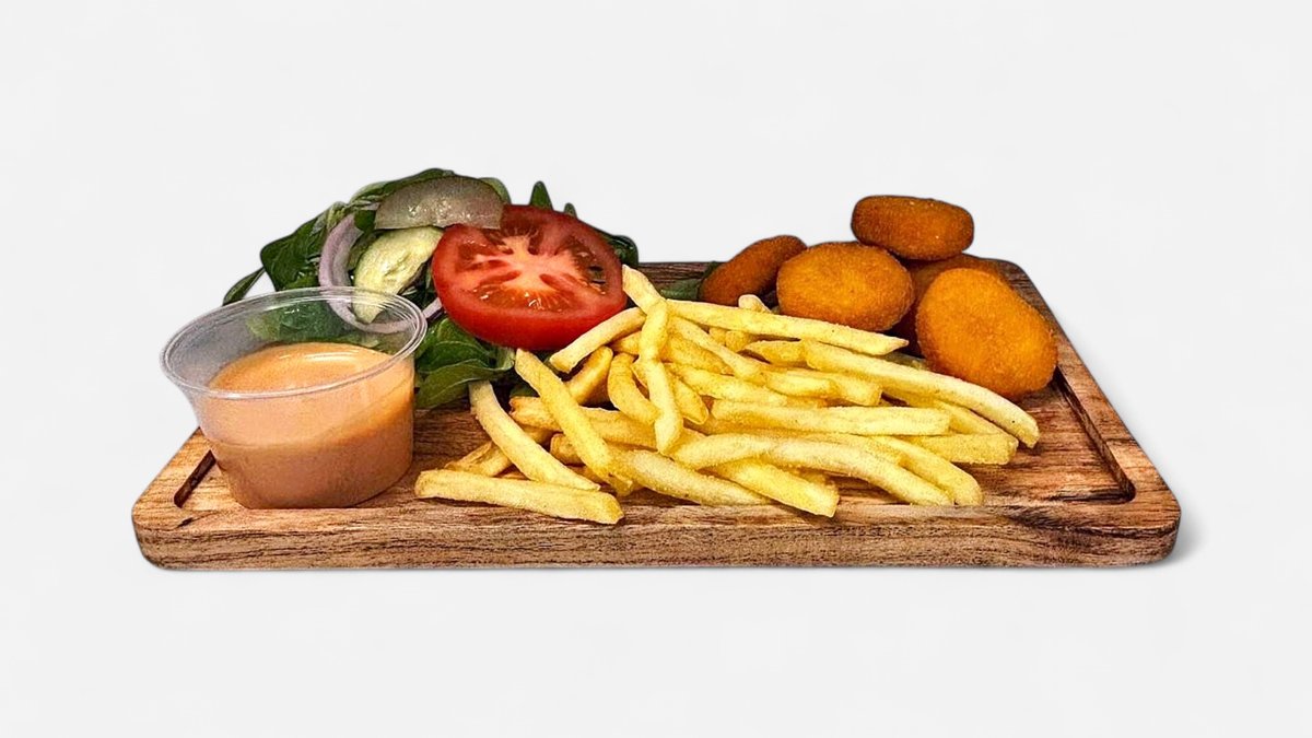 Kuřecí nugetky 7ks, střední hranolky, zeleninová příloha, dresing dle výběru