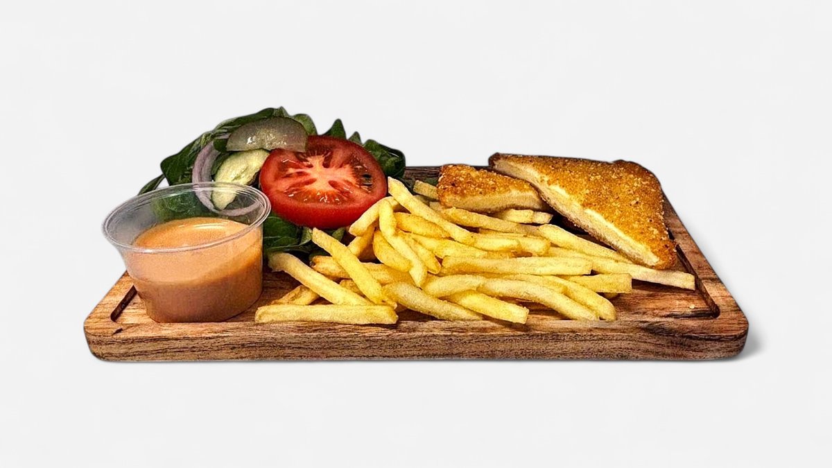 Obalovaný sýr, střední hranolky/véčka, zeleninová příloha, dresing dle výběru