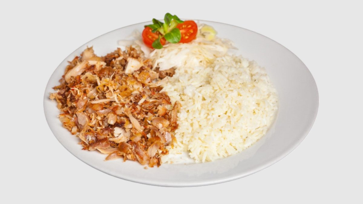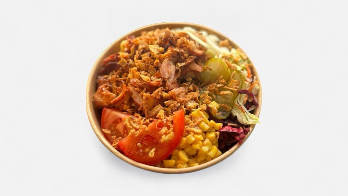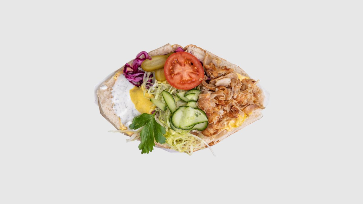 100% Kuřecí maso, Hranolky nebo Rýže, Zelí, Rajče, Cibule, Kukuřice, Okurky, Olivy, Omáčku.