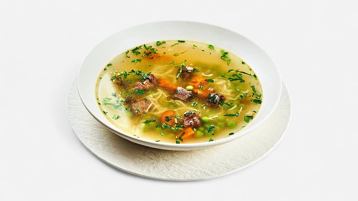 Hovězí vývar s restovanou zeleninou, nudlemi a masem