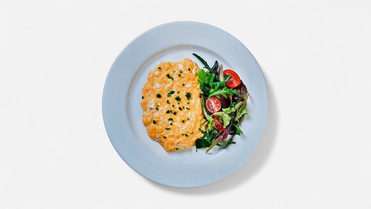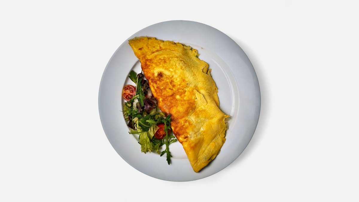 Složení: vaječná omeleta (3 vejce, smetana), máslo, vepřová šunka, sýr eidam, baby špenát, cherry rajčátka, žampiony, salát mix (římský, ledový, dubový, rukola), vinegret (vinný ocet, olivový olej, cukr moučka) 250g