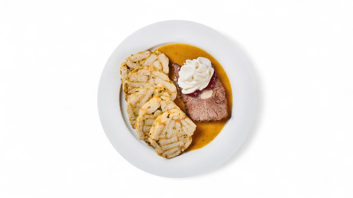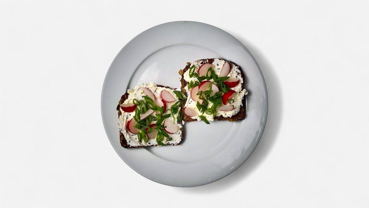 Složení: žitný tmavý chléb 2 plátky, pažitková pomazánka (tvaroh, smetana, pažitka), ředkvička, cibule lahůdková