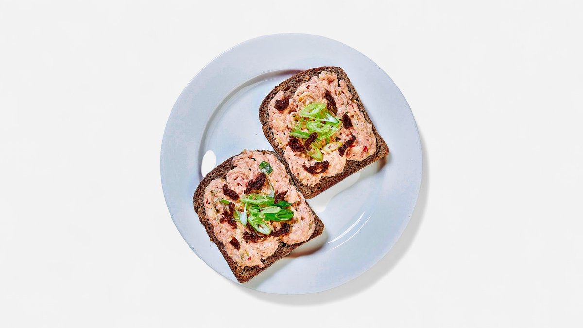 Složení: žitný chléb 2 plátky, salámová pomazánka s chilli a jarní cibulkou (gothaj, majonéza, okurka sterilovaná, cibule, koření chilli paprika, česnek), cibule lahůdková, sušená rajčata v oleji