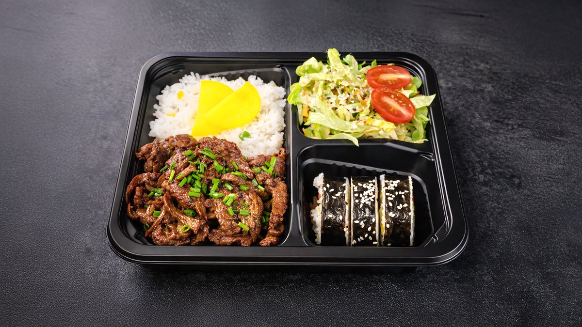 Pork Bento 155 Kč 🍱 Šťavnaté vepřové maso položené na Mačkané brambory s smaženým cibulí, s naší sladko-slanou omáčkou. Podáváme s rýží, salátem, kimbabem a čerstvou zeleninou. Alergeny: 6 (sója), 11 (sezam)