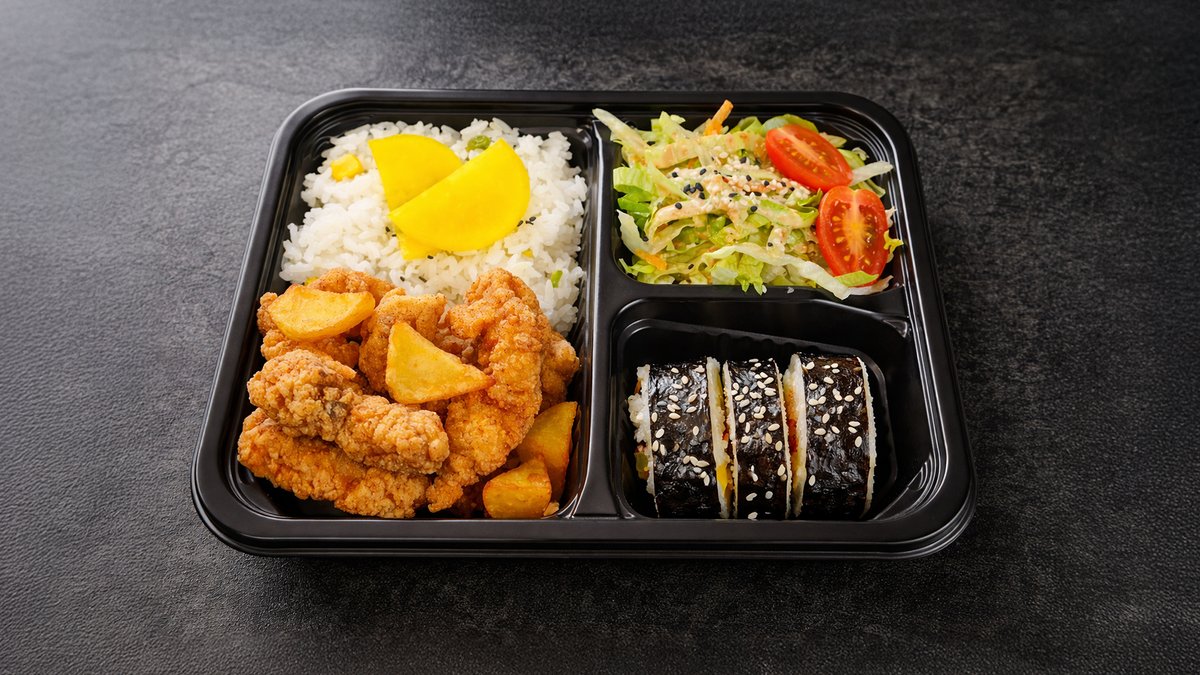 Chicken Bento 155 Kč 🍗🔥 Kuřecí maso restované s pikantní zeleninou 🔥 a jemnými bramborami. Podáváme s rýží, salátem a kimbabem. Alergeny: 6 (sója), 11 (sezam)