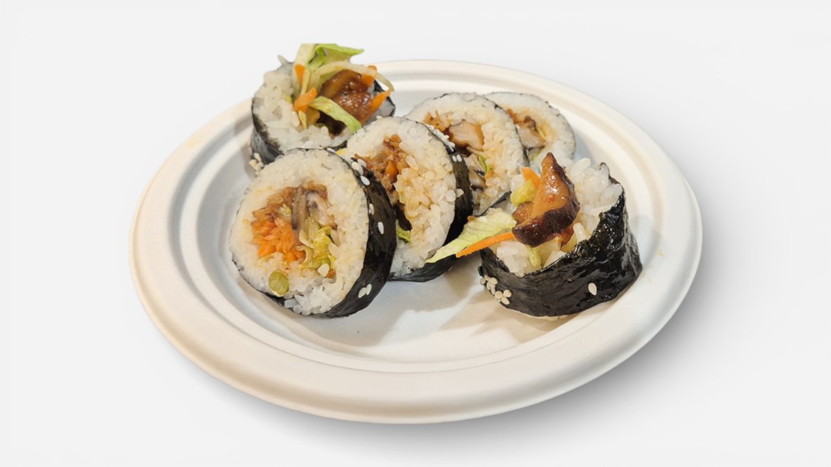 shitake houbi rýže, mořské řasy, mrkev,, LEDOVÝ salat, majonez sezam a další koření ALERGENY: 1,3,4,6,11