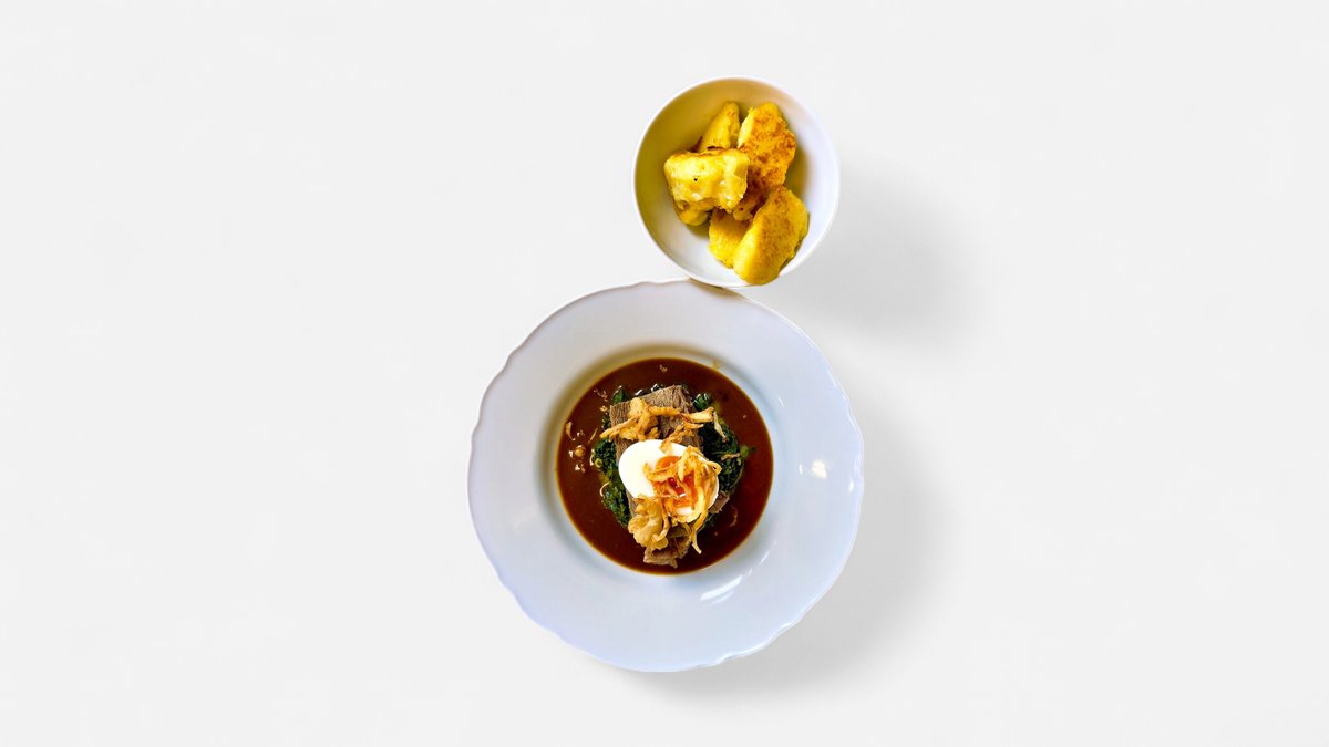 vyzrálá hovězí kulatá plec, špenát, chlupatý knedlík, jus, vejce na hniličku