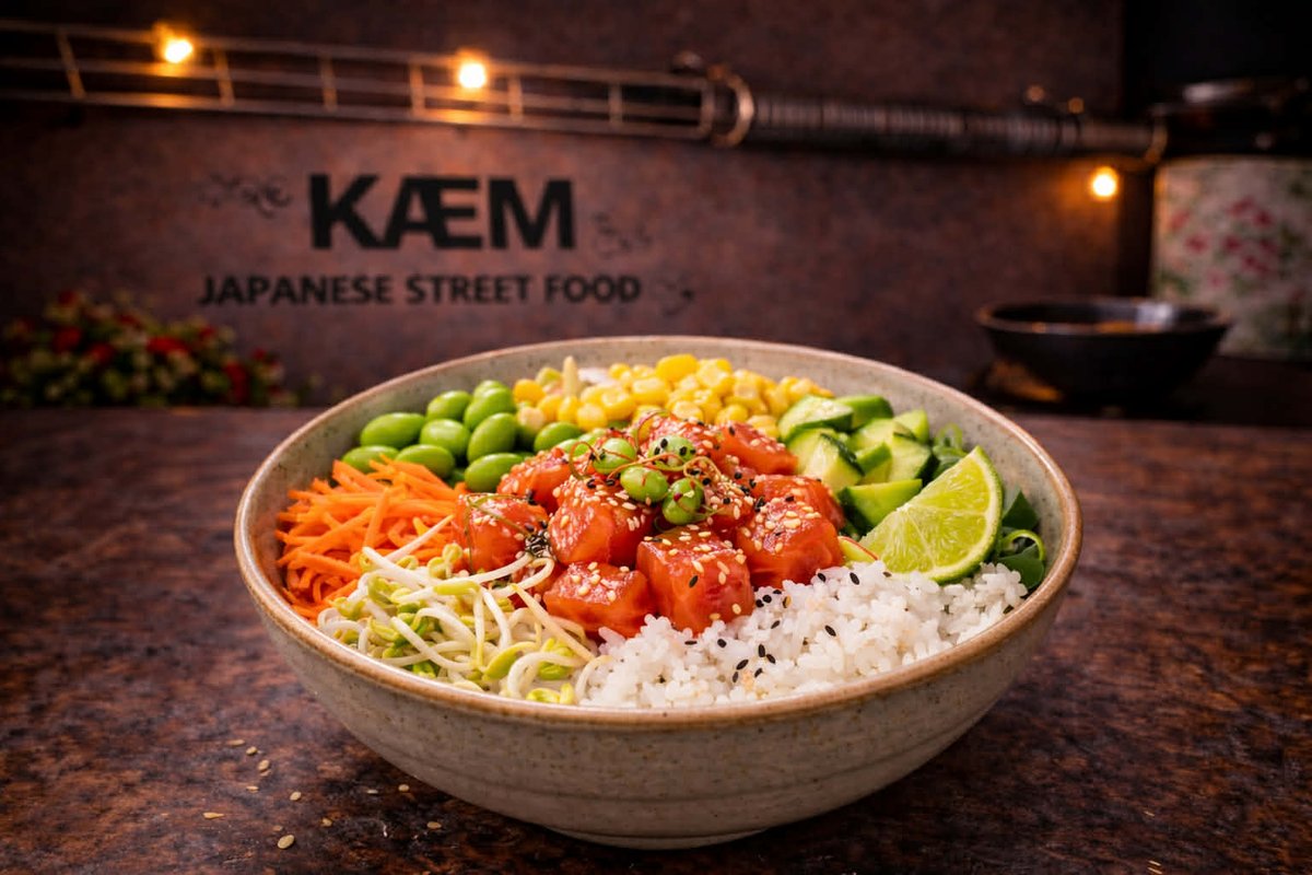 Losos marinovaný v sójové omáčce (shoyu), sushi rýže, avokádo, edamame, okurka, mrkev, kukuřice, mungo klíčky, jarní cibulka, sezam, sweet lemon majonéza a limetka