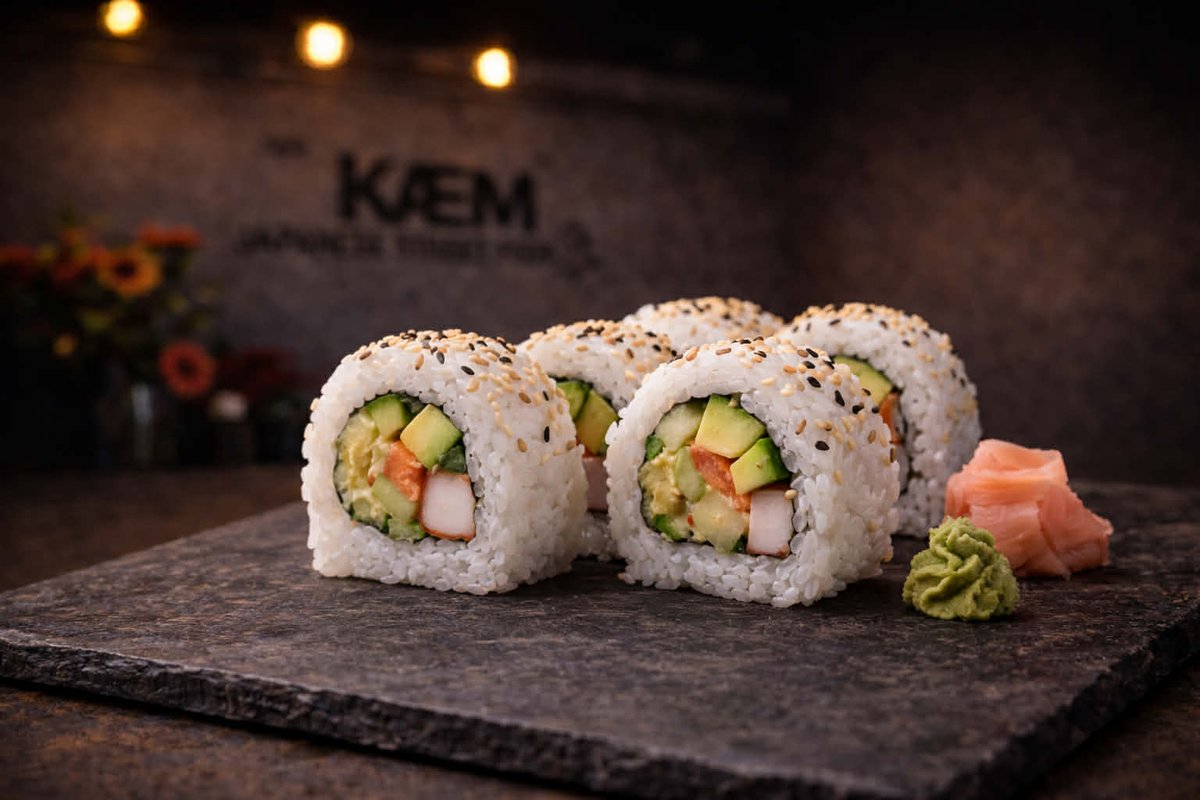 Oblíbená sushi rolka typu uramaki s krabí tyčinkou (surimi), avokádem, okurkou, obalená v sushi rýži a sezamu