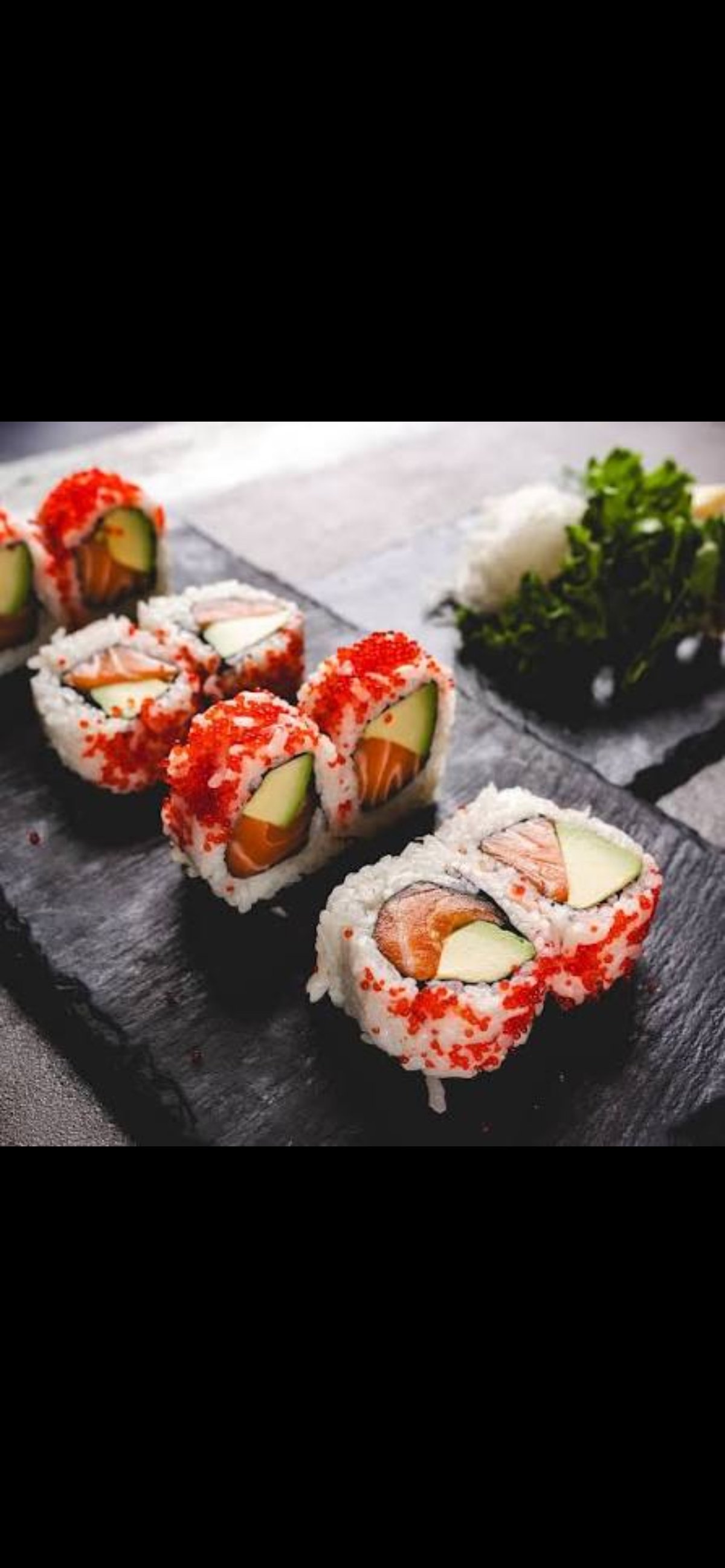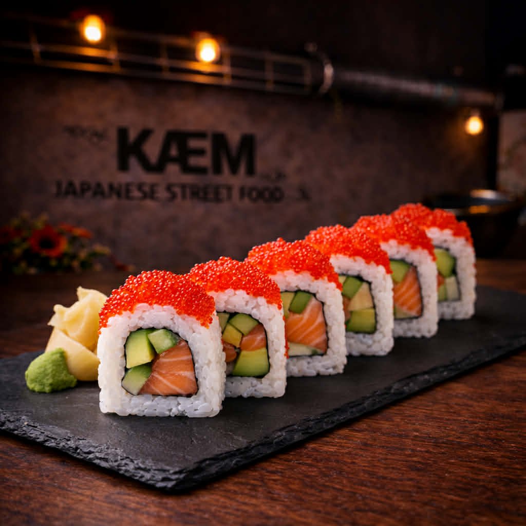 Losos, avokádo a okurka, obalené v rýži, doplněné červeným kaviárem.