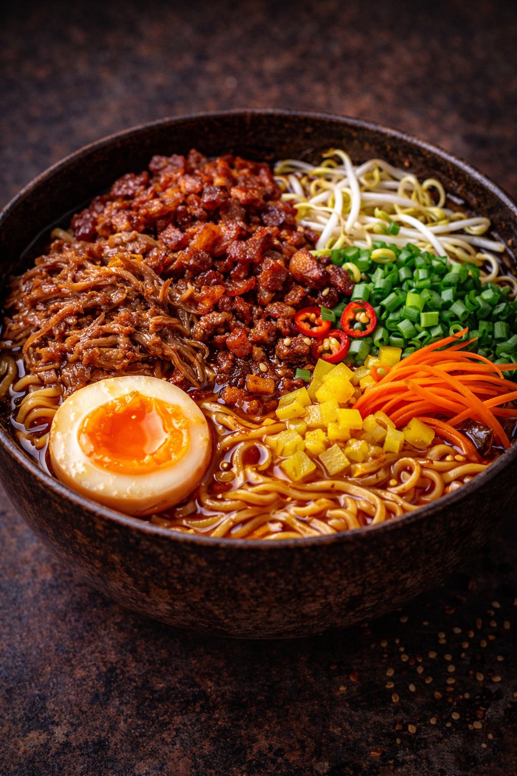 Japonské ramen nudle bez vývaru podávané s výraznou omáčkou, doplněné šťavnatým vepřovým masem, křupavou slaninou, marinovaným vejcem, mungo klíčky, mrkví, jarní cibulkou a žlutou ředkví.
