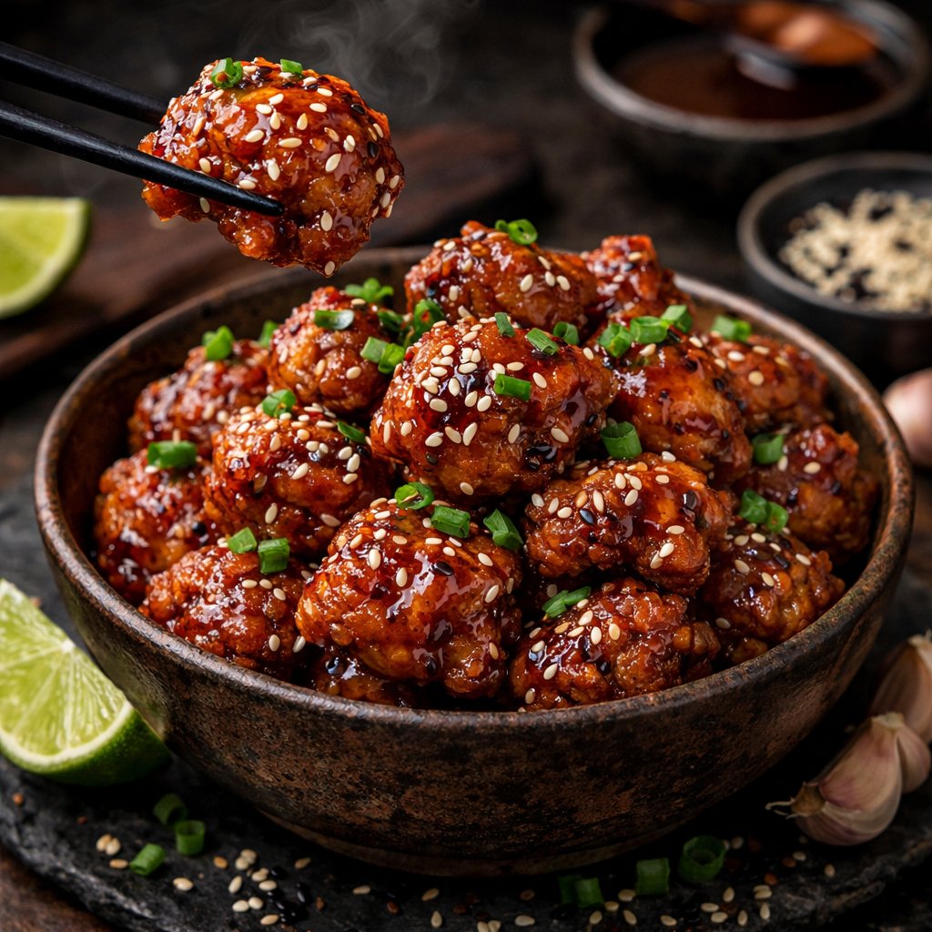 Křupavé smažené kuřecí kousky v lehce nasládlé sójové glazuře s česnekem, podávané s jarní cibulkou a sezamem.