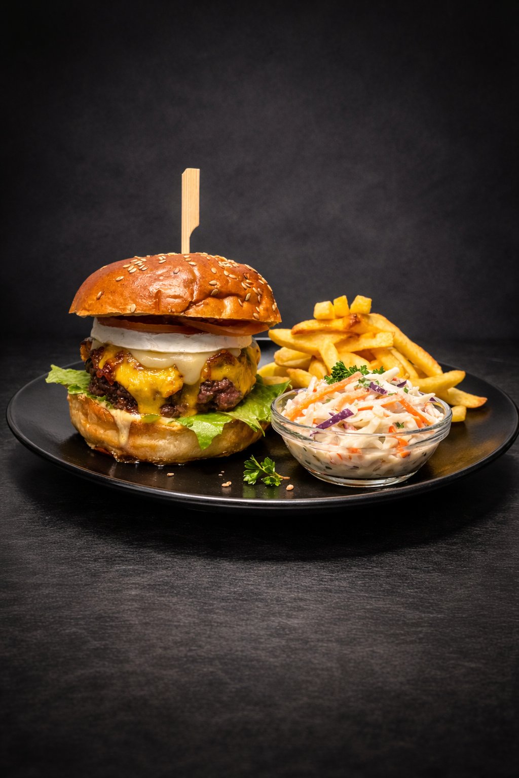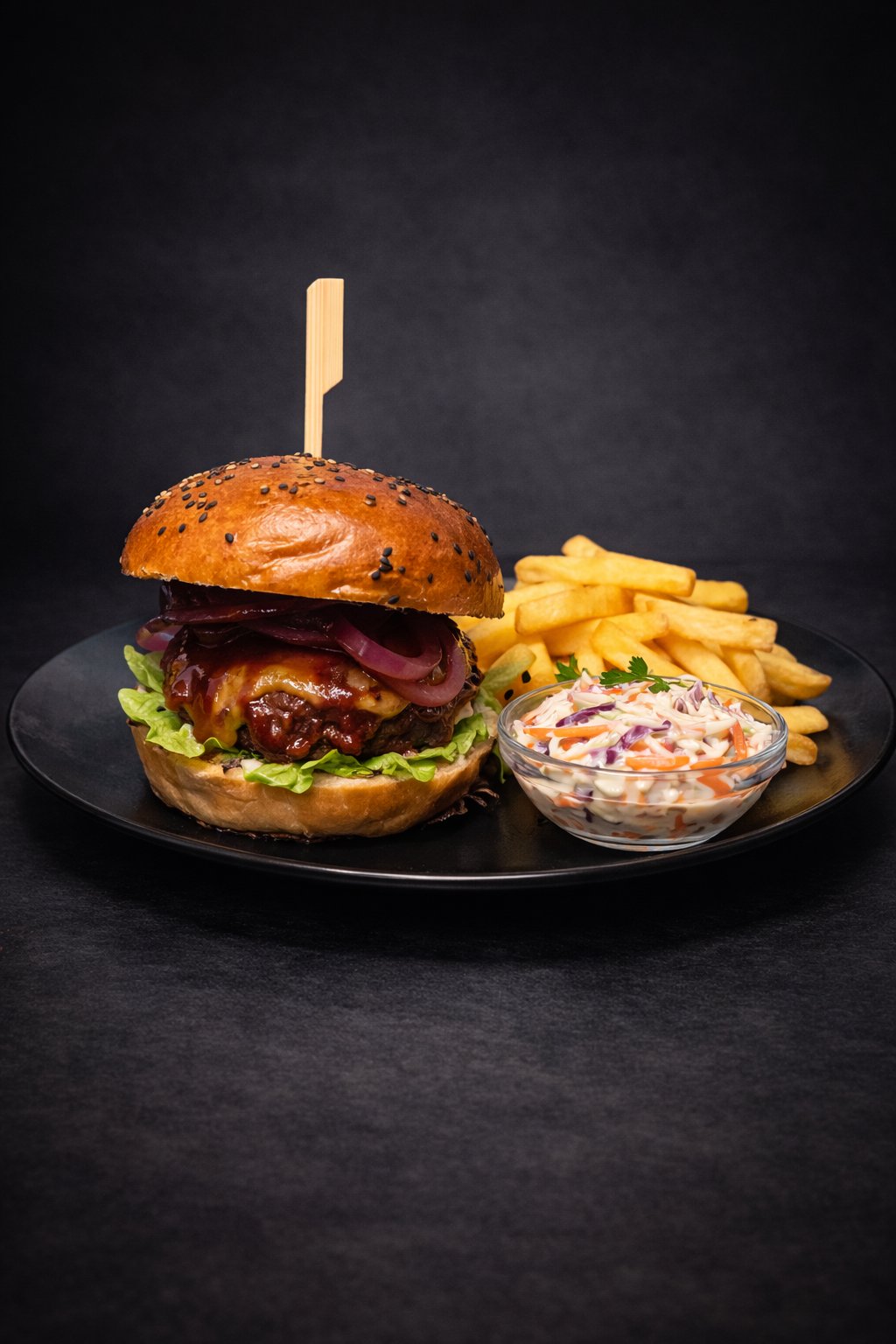 180G HOVĚZÍ MASO, BBQ OMÁČKA, LED. SALÁT, RAJČE, CHEDDAR, SLANINA, CIBULE, HRANOLKY, SALÁT COLESLAW (1,7)