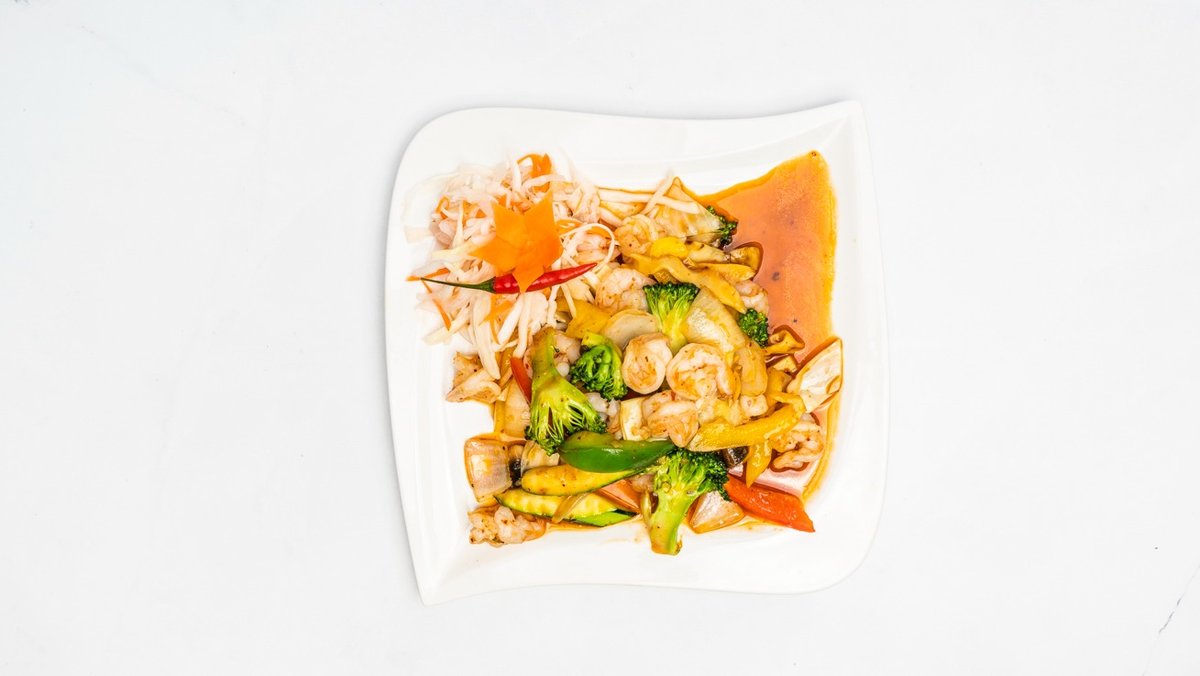20. Smažené vepřové maso, zelenina, omáčka pálivá