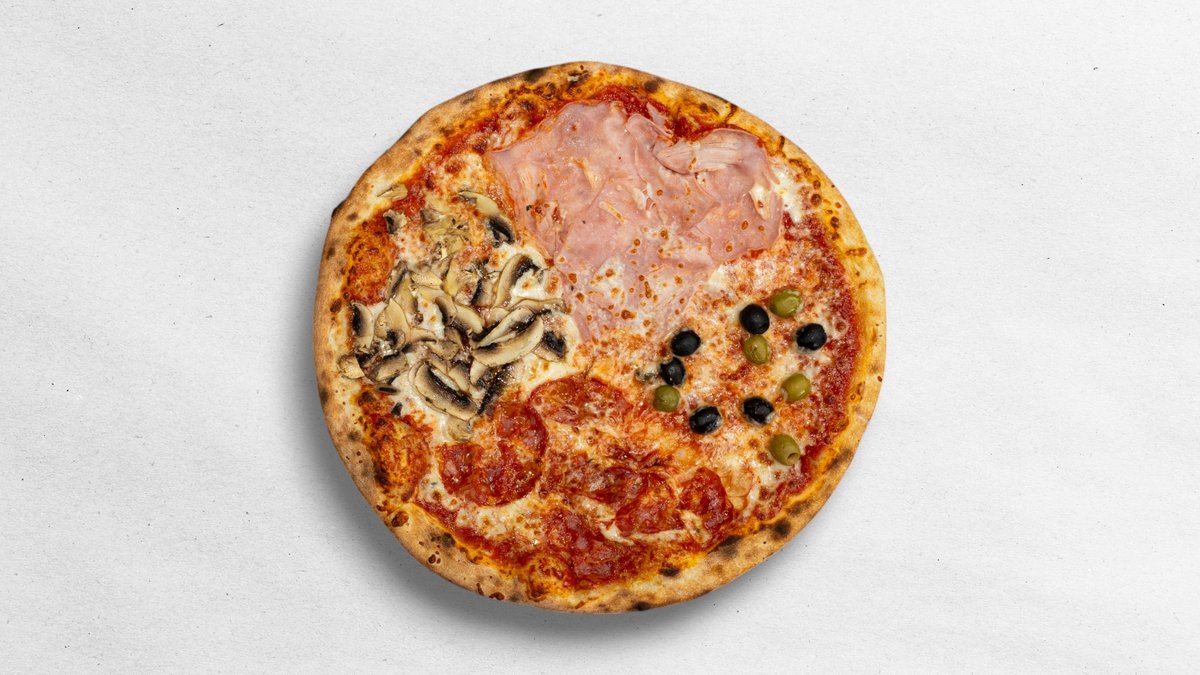 italská rajčata, mozzarella, šunka, ventricina, olivy, žampiony. Cena včetně obalu 360g