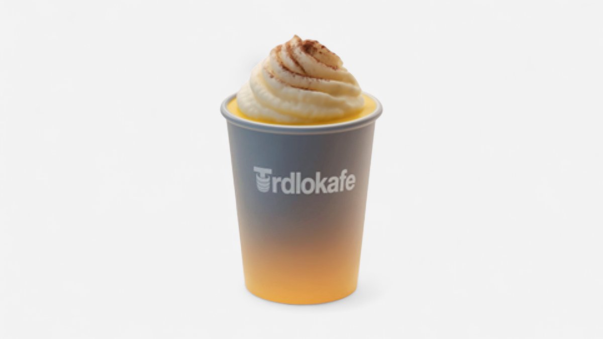 espresso, našlehaná mikropěna z mléka a sirupu, šlehačka a posyp, příchuť a velikost kávy dle vašeho výběru.